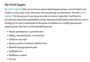 any of My Grief Angels' free peer-led zoom-based groups by type of loss experienced, and following them, the directory of other nationwide groups - the directory is a work in progress public service project